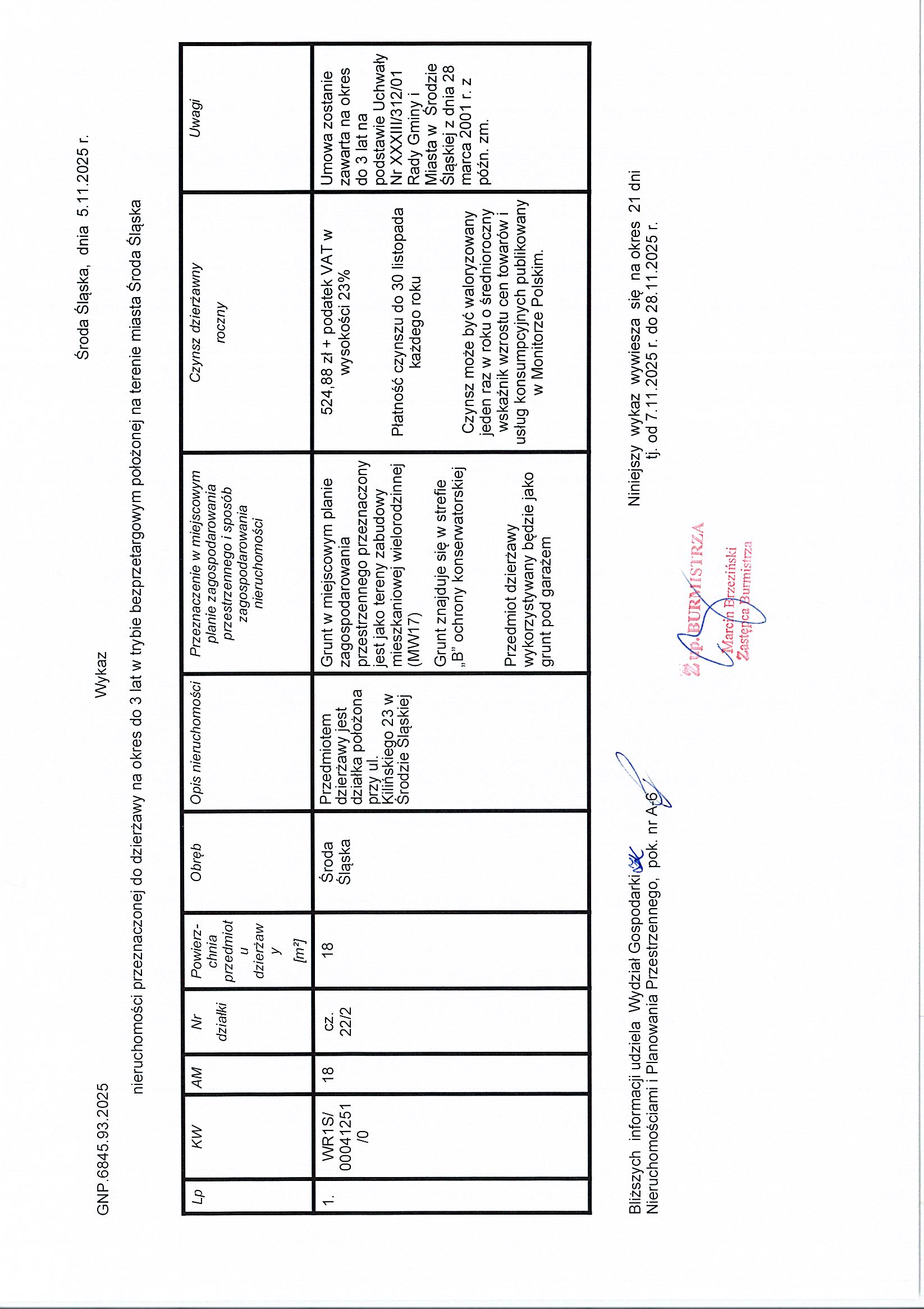 Wykaz nieruchomości przeznaczonej do dzierżawy na okres do 3 lat w trybie bezprzetargowym położonej na terenie miasta Środa Śląska