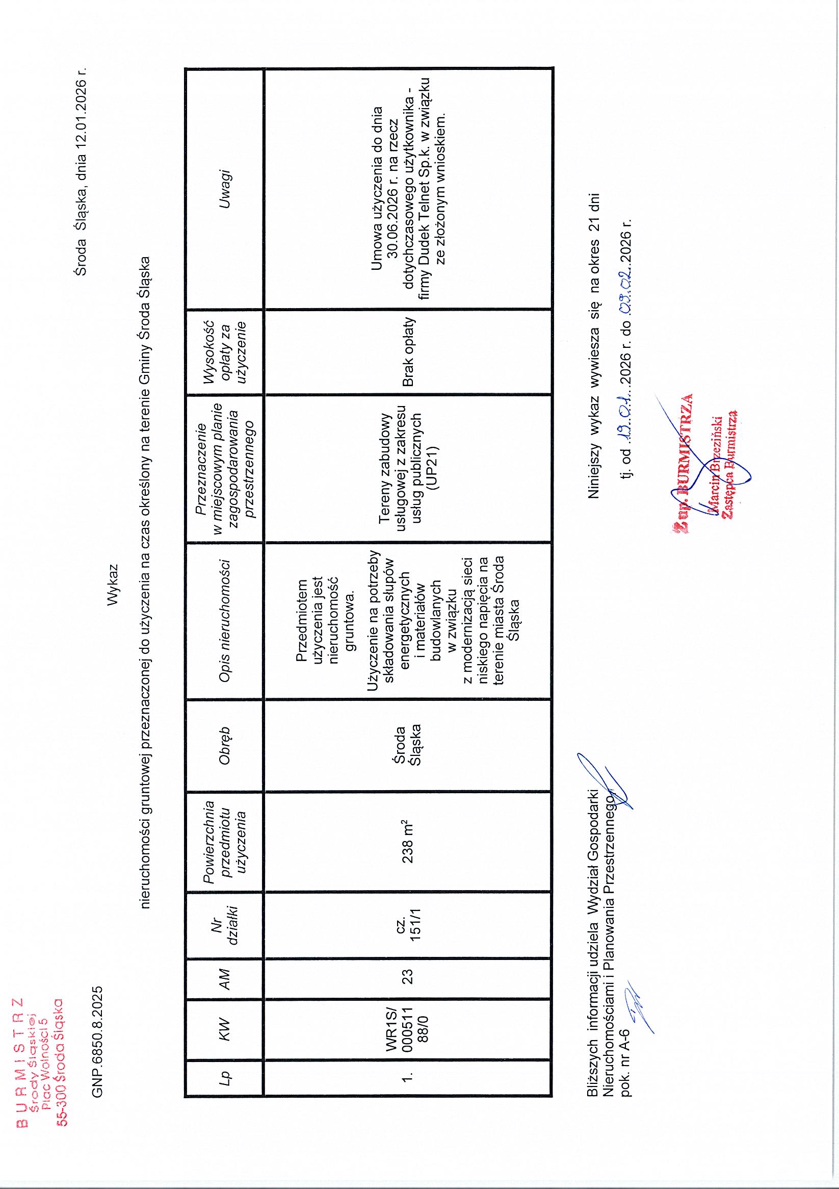Wykaz nieruchomości gruntowej przeznaczonej do użyczenia na czas określony na terenie Gminy Środa Śląska.