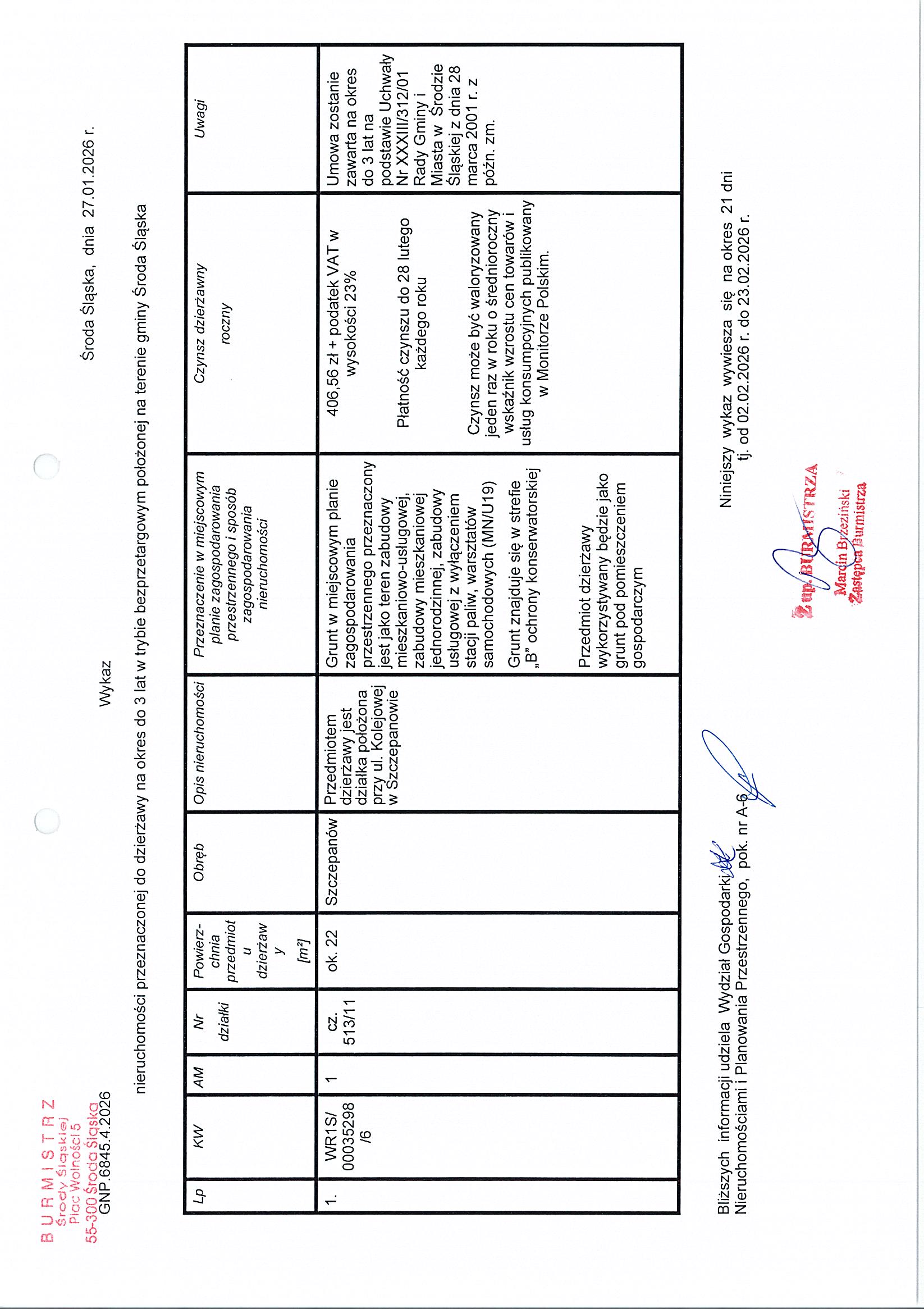 Wykaz nieruchomości przeznaczonej do dzierżawy na okres do 3 lat w trybie bezprzetargowym położonej na terenie gminy Środa Śląska