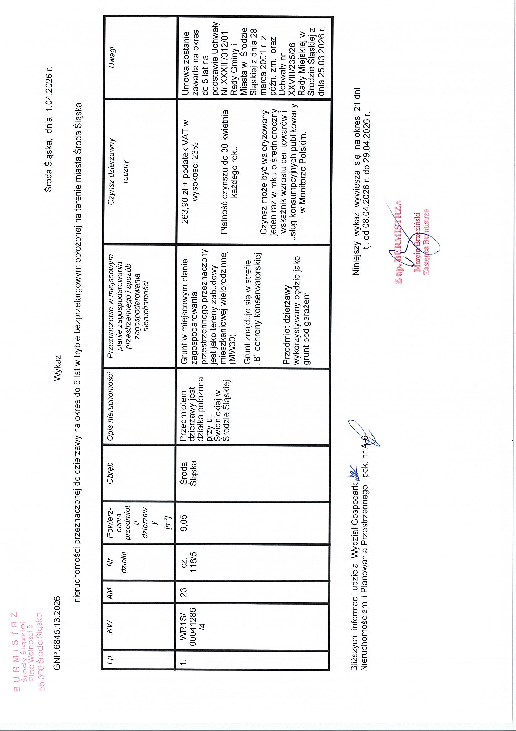 Wykaz nieruchomości przeznaczonej do dzierżawy na okres do 5 lat w trybie bezprzetargowym położonej na terenie miasta Środa Śląska