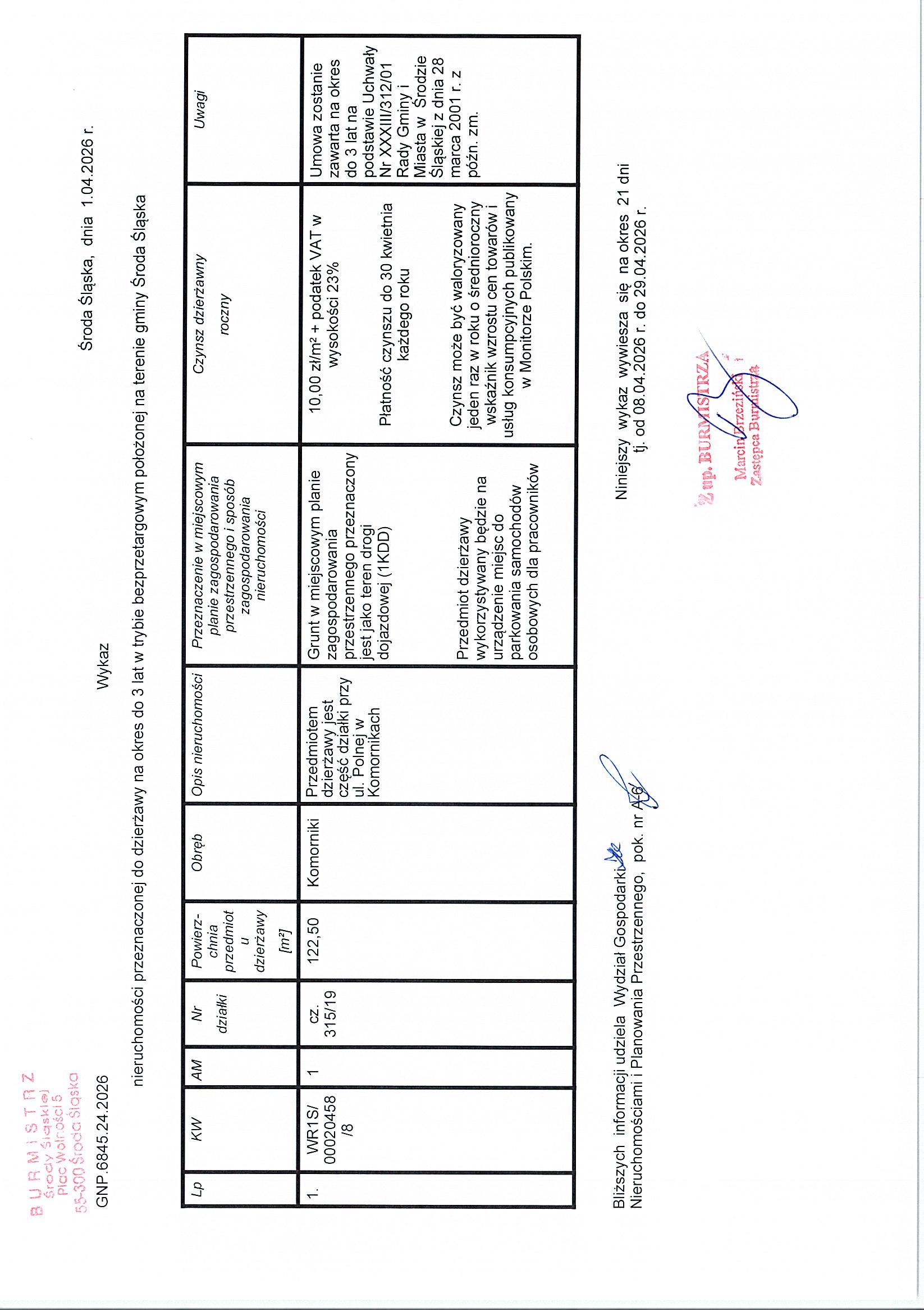 Wykaz nieruchomości przeznaczonej do dzierżawy na okres do 3 lat w trybie bezprzetargowym położonej na terenie gminy Środa Śląska